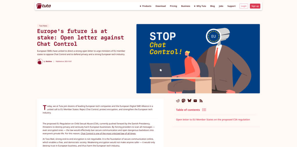 Together with more than 40 European privacy-first companies as well as the European Digital SME Alliance, representing more than 45.000 digital SMEs, Tuta urges ministers of EU member states to defend Europe’s digital sovereignty and reject this draft law that normalizes mass surveillance and weakens encryption.