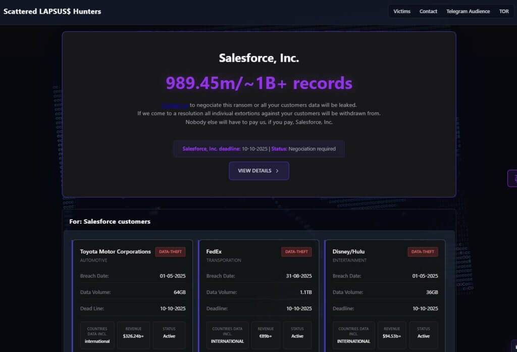 A hacker group calling itself Scattered Lapsus$ Hunters has published a dark-web “data leak” website claiming to have stolen nearly one billion records from the Salesforce environments of dozens of organizations. The site lists approximately 39 victim companies, including major names such as Cisco, McDonald’s, KLM, Disney, Home Depot, and Adidas, among others. The threat actors are demanding ransom payments by October 10; if the deadlines pass without payment, they say they will publish the stolen data.